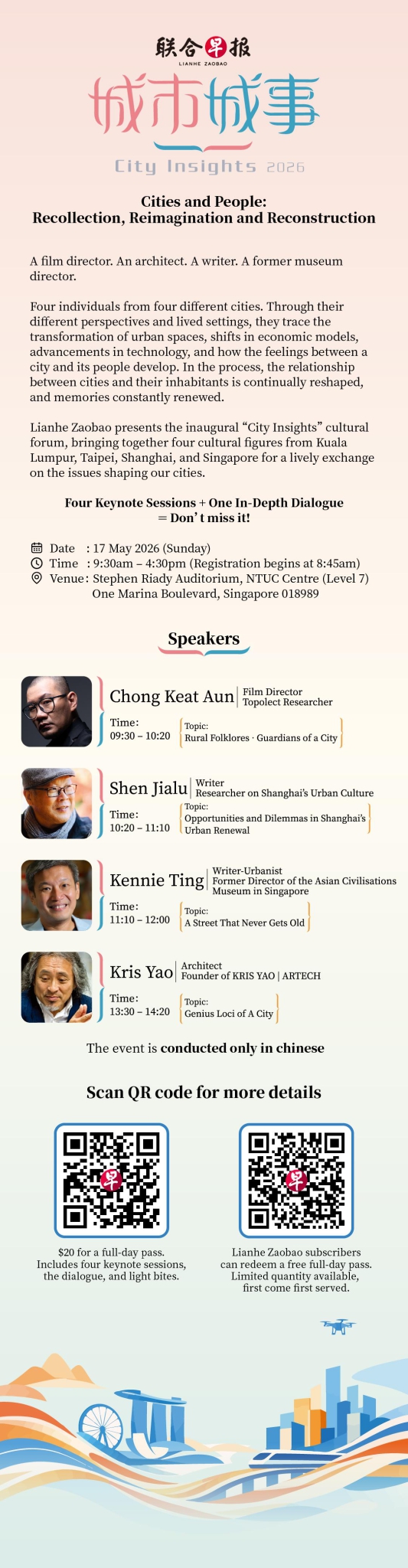 Invited by Lianhe Zaobao, Kris Yao, Hon. FAIA, joins the inaugural "City Insights" forum. Centered on his theme, "The Genius Loci of a City," he will discuss the ties between cities and people through recollection, reimagination and reconstruction with three fellow keynote speakers.