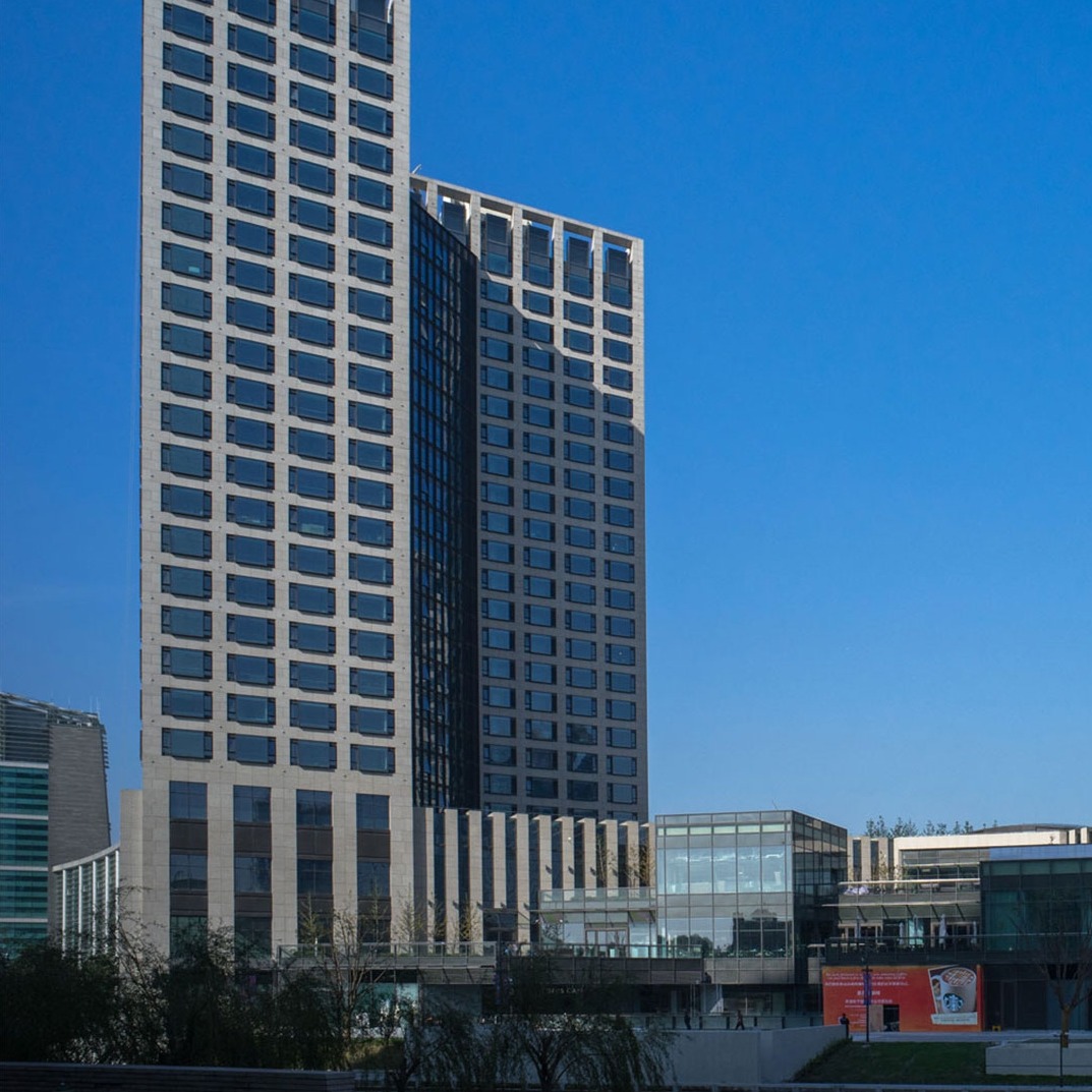 In a city where sunlight beams down over six months annually, the frames of the skylight and street facade utilizes light and shadow to mimic neatly-placed books on the shelves. They not only accentuate the movement of shadows throughout the day, but also serve as shading devices which block out excessive light and solar gain for energy-savings. In addition, the facade features window lattices reinterpreted from The Classical Gardens of Suzhou fused with the business logo of Eslite Bookstore. Along with large LED screens and other lighting designs, they constitute a new city block brimming with art, culture, creativity, and life. Large bay windows extruded out from the two towers, allowing ample light to fill up the internal spaces. Column framework and stone cladding cover the remaining surfaces, rendering the towers not of the typical fully-glazed highrise, but which embrace cultural context and spatial functions without sacrificing user comforts.