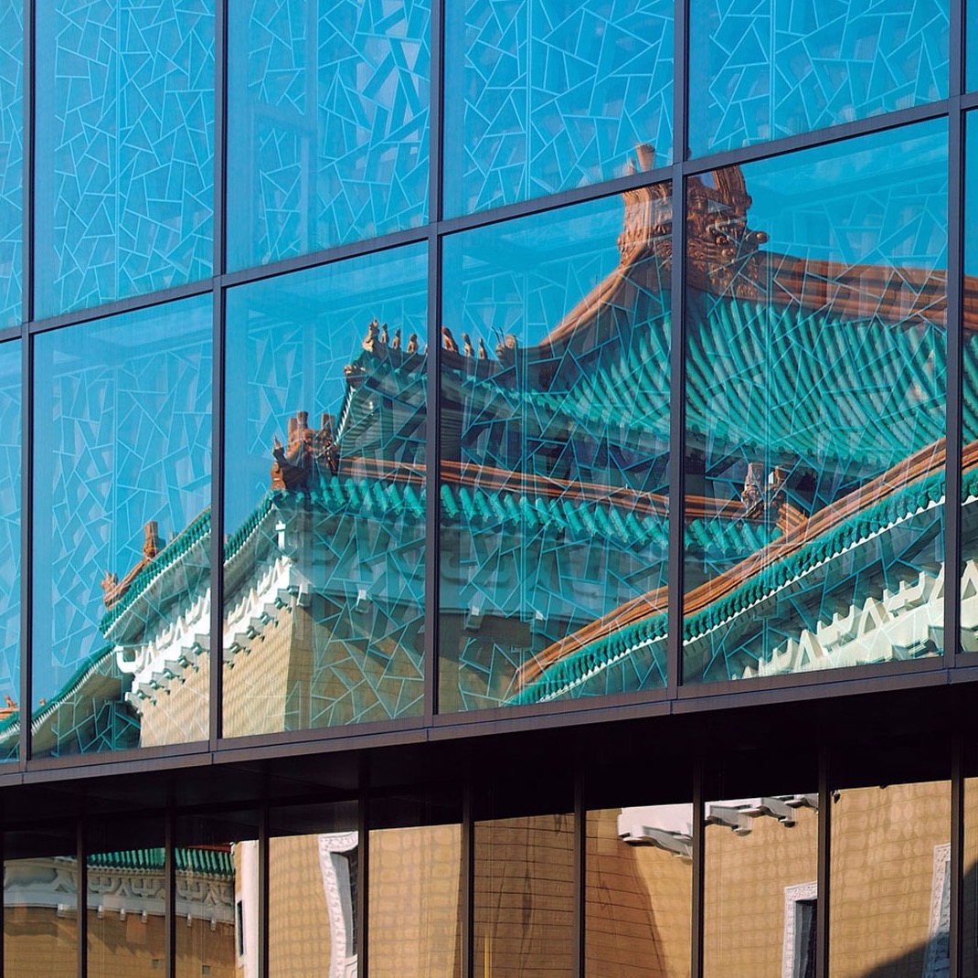 Responding to an old Chinese saying: “color weights more than form”, the selection of the color scheme was one of the project’s key concerns. The dark brown stone podium extends the visual continuation from the brown tile base of the existing buildings; the yellow ochre roof tile shingles laid on the four cores are transformed, with a slight twist, from the old yellow tiles on the existing walls; and the green hue on the “ice-cracked” sun shades is derived from the existing green glazed roof tiles. The continuation of the colors, namely the rusty brown, yellow ochre, and bronze green, which form the basic palette for the National Palace Museum complex, has contributed to the harmony between the old and the new.