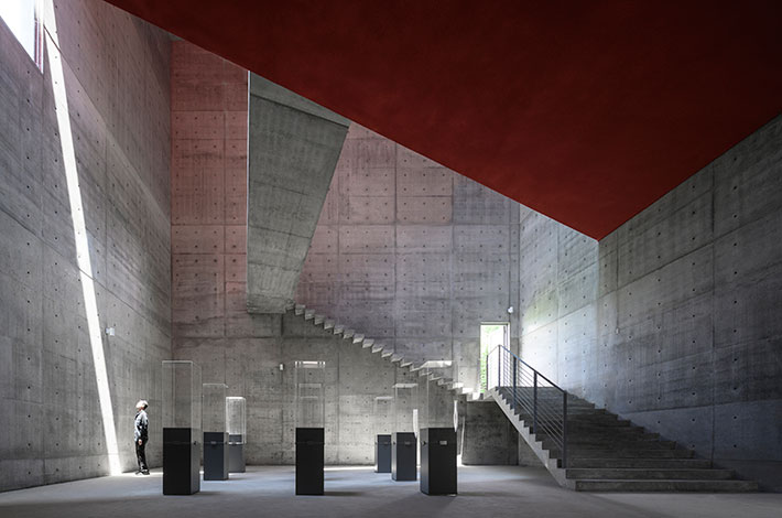 The building's spatial arrangement invites visitors to ascend a low-rise staircase above a reflecting pool and enter through a side entrance adjacent to the main cube. Within the impressive 13.5-meter-tall student exhibition space, an imposing cubic mass appears to defy gravity as it floats above the area. This cube houses the Han Pao-Teh's Permanent Exhibition, a two-story, auditorium-like space that juts diagonally from the larger cube. The rotated cube creates a fissure in the wall, through which light dramatically casts into the cavernous exhibition space, casting sharp shadows and imbuing the atmosphere with an air of theatricality.