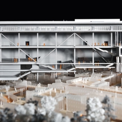 空間配置導入開放式美術館的概念,地面層的藝術街坊以老街的空間尺度,規劃各類與藝術相關的商店、書店、工作坊、咖啡廳或藝術教室等,錯落的清水混凝土牆圍塑層次豐富的戶外廣場,串連室內空間,訪客可在其中流連、參與各種藝文活動、停駐觀賞開放的裝置作品,或順著沿地勢鋪設的清水地磚,漫步至坡頂,俯瞰壯闊的山河景色。