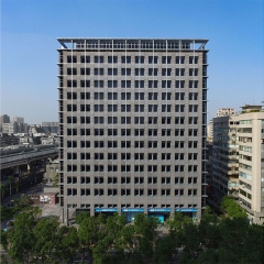 The Fubon Life Insurance Co. Headquarters is built on a corner lot, adjacent to an elevated highway, and fronted by a major boulevard. The building is also restricted by an airport 60-meter height limit. The massing of the building is rectilinear. The building is set back on the southern edge of the site to form a public plaza, which serves as a buffer to protect the office space from the highway. As for the spatial organization, an entrance hall and a commercial bank are arranged to occupy the first and second floors of the building. The entrance hall, adjacent to the plaza, is designed to form a spatial extension from the exterior into the interior. A 6-meter-high glass volume, framed in metal cornice, is recessed at the top floor to accommodate the executive office.