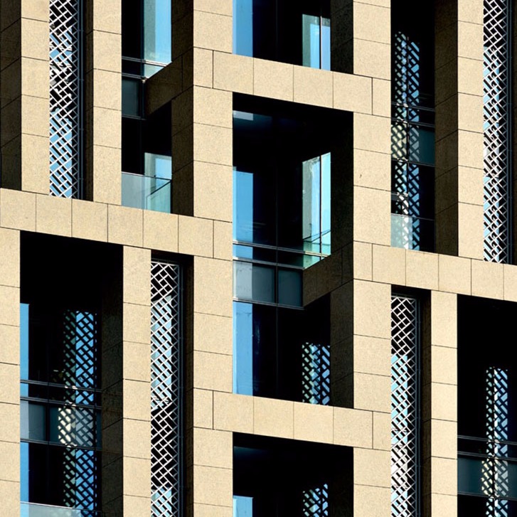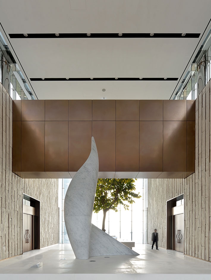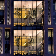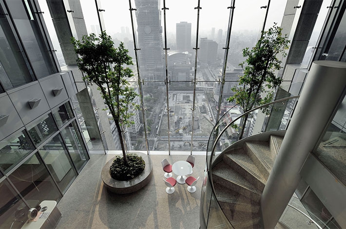The 154.5 meters tall Hua Nan Headquarters is comprised of three-story podium and twenty–seven-story office tower, with the main entrance and long side of the rectilinear plan facing the west. Detached from the exterior curtain wall, the peripheral structure is pushed out as an exoskeleton system, allowing the spaces in between for balconies, which also act as sun-shading devices to enhance sustainability in design. This design feature allows the interior space to be column-free, with a clean and smooth window line around it for flexibility in space planning. On the front center bay of the tower, a series of double-height “sky gardens” are stacked all the way to the top of the tower. They make for casual meeting and relaxing spaces for the office staff, and also serve as the buffer zones for reducing heat-gain from the west façade. Oversize ceiling fans are installed in these spaces to achieve the thermal destratification effect.