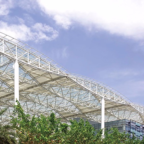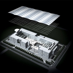 The canopy covering the courtyard is the most prominent element of the center above the inner plaza. The aerodynamic “Think-Tank” projects outward from the canopy offering an expansive view of the center and the grand canopy below. The east, west and south facades of the building are adorned with barcode-like aluminum and glass sunshades. The perforated aluminum panels and patterned glass create a visually appealing layered elevation with a high-tech image of the building.