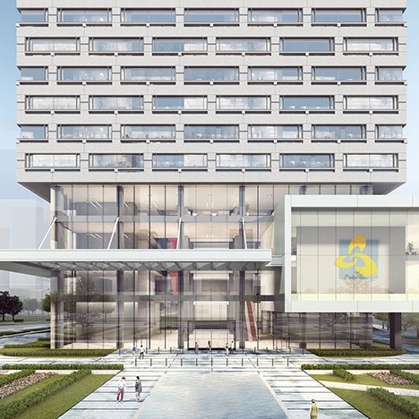 The façade, reflecting the corporate image of Xiamen Bank, integrates three Chinese cultural elements, Curio Box, Jade Screen, and Brick House in a modern architectural approach. The exterior uses high quantity of stone to add a sense of stability to the building. The large window openings capturing traditional Chinese brick construction, and the projecting glass boxes that match the internal 6-story high green space and the 3-story high business center on top, create a friendly and playful architectural façade.