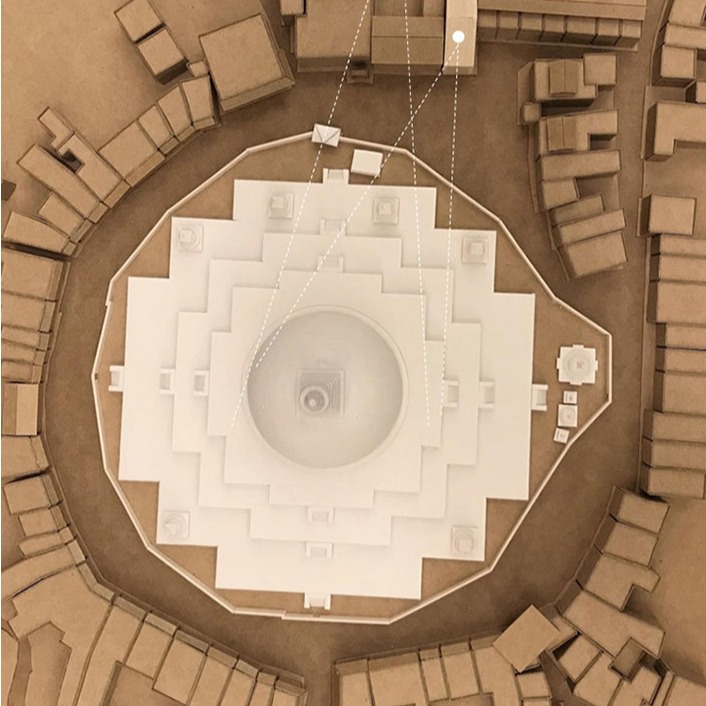 Turning left from the Tube, one reaches the “Forum”, the public space of Licchavi House. On the ground level, 100 people can be accommodated in the auditorium / theater / lecture hall during gatherings, teachings, movie screenings, music events and other performances. Through a stairway one reaches up to the co-working space, yoga studio, and meditation hall on the upper floors. From the meditation hall, visitors have an excellent view of the Stupa and a panoramic view of the city.