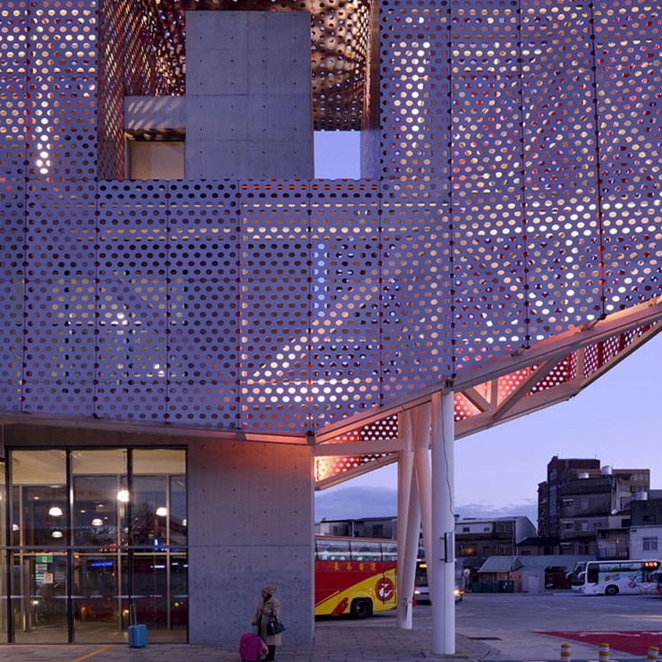 The two-story architectural concrete terminal building is simple and straightforward, with buses circling on the outer peripheral areas and people entering from the center, avoiding any conflicts between them. The “billboard” part of the building features lofty steel frameworks cladded with perforated aluminum panels. In the daytime, this gigantic billboard mainly shows its silver-metallic color on the outside; while in the evenings, the bright red color from inside reveals itself, giving the terminal a new urban energy and a sleek sight.