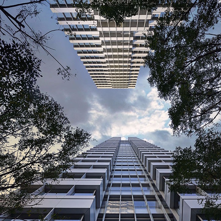 這棟優雅而現代化的大樓由三個建築元素組成,地面層將挑高8米的大廳退縮,以柱廊與通透明亮的玻璃外牆營造入口意象;低樓層是18層樓高的辦公室,正立面是白色網印的垂直玻璃遮陽板,側面則為水平連續的鋁板與玻璃帷幕,以垂直與水平線條的對比營造立面的層次;高樓層則是10層的住宅延續辦公層側面元素的水平鋁板及玻璃帷幕為造型。隨著高度向上,空間的私密性及窗景的視野也隨之增加。