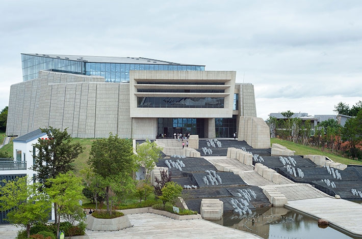 本展示館為黃山市的迎賓處。「黃山四千仞」自此開始。展示館座落於一高地,與鄰近之商業街坊共同面向一城市廣場。巨大的石塊臺階引領參觀者拾級而上,兩側有大小水瀑在期間川流。建築物外牆由一系列的巨大牆體片段所構成,外掛手工鑿切的厚實黃色花崗岩。建築物內部延續石牆主題,採天光的中庭位於建築物中心,聯繫所有大大小小的展廳。