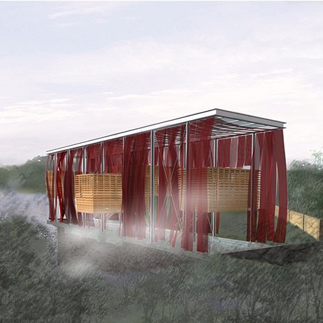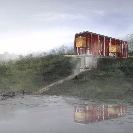 來自全球各地的二十名建築師受邀為中國南京佛手湖畔各自設計一幢五房的渡假小屋。我們的提案仿若傳統染坊的結構,外部懸掛著布質帷幔,隨風搖曳,掩隱了建築物的框架,創造出模糊不定的型態。