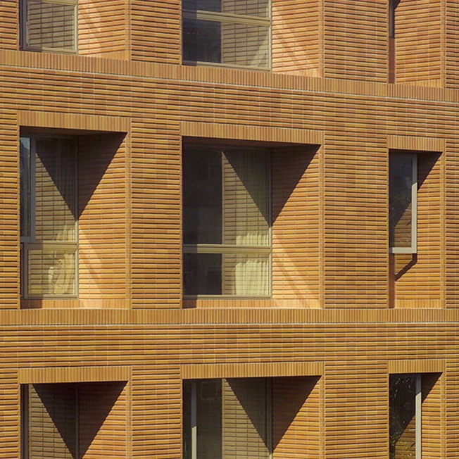 這一棟13層高的公寓大廈,坐落在住宅區的靜巷內,周圍是臺大學區與中央政府機關群,渲染出濃厚的文藝氣息。呈h形的平面配置,以服務核為中心,提供各樓層三戶住宿單元簡明的動線,以及最佳的自然採光和通風。為配合基地附近的老樹群,設計上著重建築元素與庭園景觀相互搭配,利用綠地、廣場、步道、水景組成的連續性綠帶與多重步道系統,創造出豐富的視覺變化,並讓居民得以親近城市住宅難得的自然生態。本案以石材及山型磚構築外牆,透過材質的有趣交織,為沉穩的外觀添加活潑的意象。
