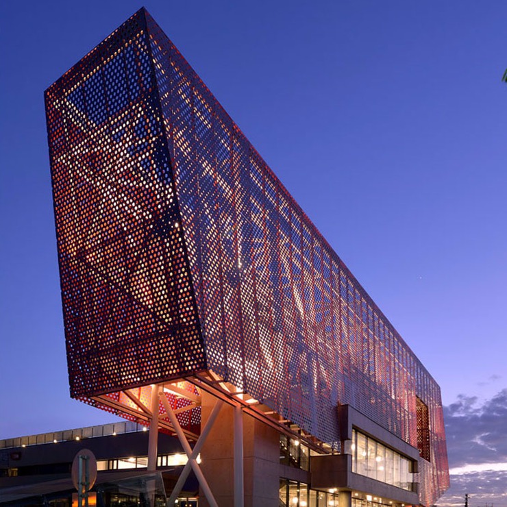 以清水混凝土建造的轉運站主體相當直接明瞭。客運車在外圍遶行,旅客自站體中央進出,有效地避免了兩者可能產生的衝突。上方“招牌”造型則是以空體鋼構構成,其外覆沖孔鋁板。在白天,此巨型招牌主要顯示出金屬質感的銀灰色,而在夜間,沖孔鋁板內部的鮮紅色藉由燈光露出,形成都市中新穎活潑力的辨識性。